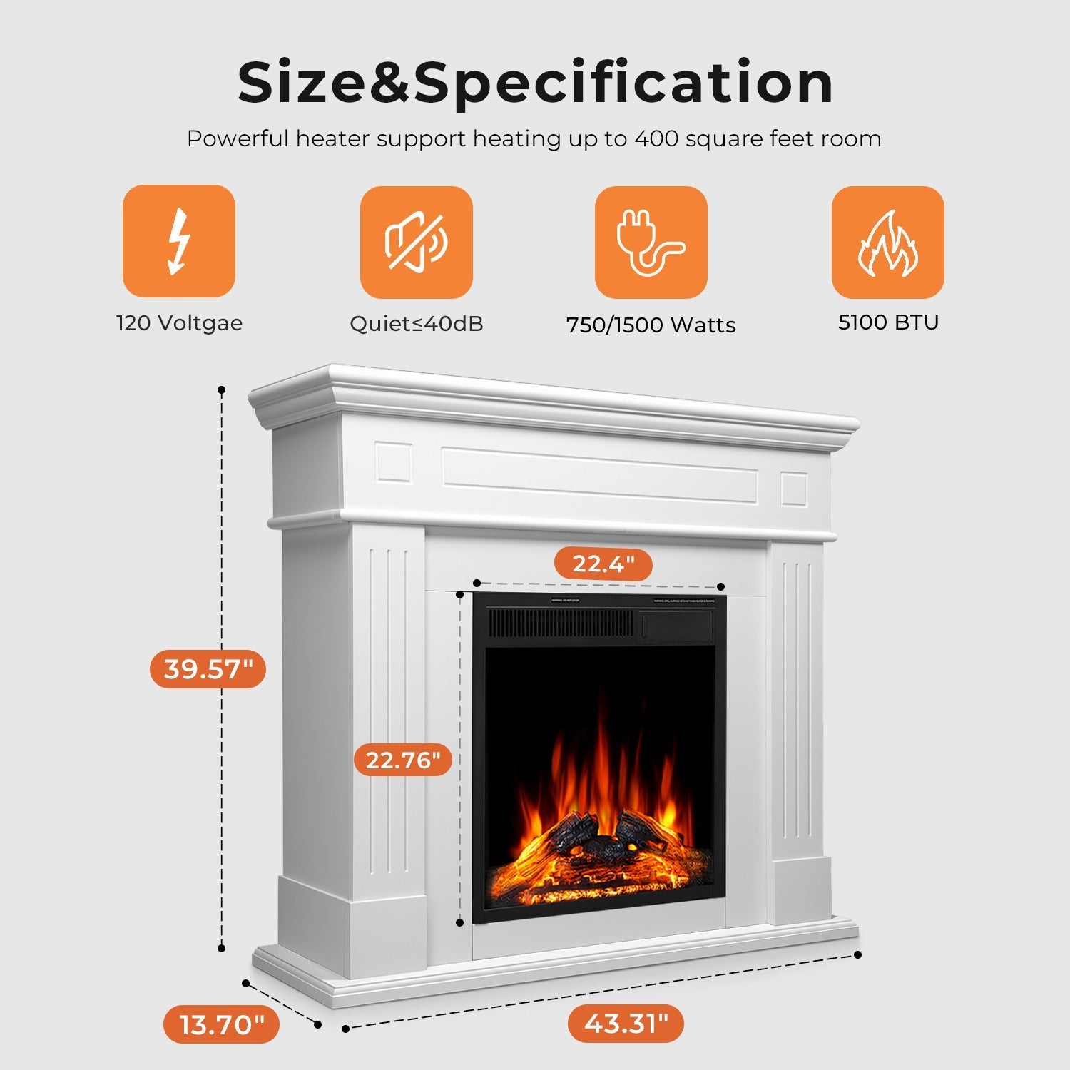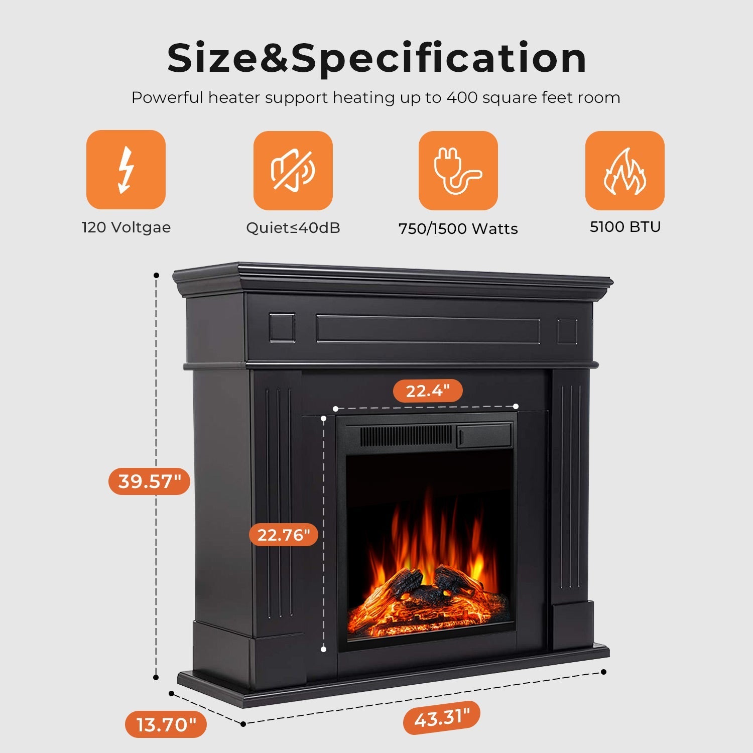 - Dimensions & Thoughtful Packaging: Electric Fireplace with Mantel is 43.39″W*13.7″D*39.68″H. For the complete and safe delivery of the fireplace, it will be sent out in two packages. Please wait patiently for both packages to arrive.